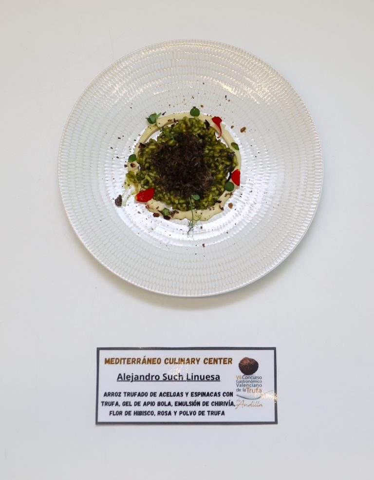 El tercer puesto ha recaído en el chef Alex Such, Director Gastronómico de Mediterráneo Culinary Center y chef de eventos quien ha sorprendido con un arroz trufado de acelgas y espinacas con trufa, gel de apio bola, emulsión de chirivía y trufa, flor de hibisco, rosa y polvo de trufa